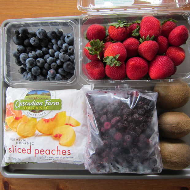 Usé: fresas, kiwi, duraznos, arándanos y frambuesas silvestres de negro (que somos como una familia mientras senderismo!). Una vez que se cocinaron los arándanos y frambuesas negro abajo el color era tan similar que no podía decir la diferencia.