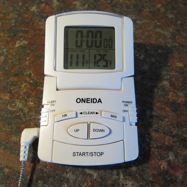 Una vez que el puré está listo establece su horno en la posición más baja. Utiliza un termómetro para carnes con cable (imagen no muestra la temperatura exacta) para mantener la temperatura del horno. Mi horno tiene un ajuste 'caliente' con la siguiente configuración es 200 grados F. Cuando puse mi horno en "warm" mi termómetro Lea 230 grados F por lo que no podía confiar en mis ajustes! Dirán más instrucciones de horno deshidratador mantener a la temperatura alrededor de 140 grados F pero tengo que mantener a mina a 160 para obtener la fruta a secar correctamente. Cada horno es diferente por lo que tendrá que luchar un poco para llegar apenas a la derecha si se trata de esto en el horno demasiado.
