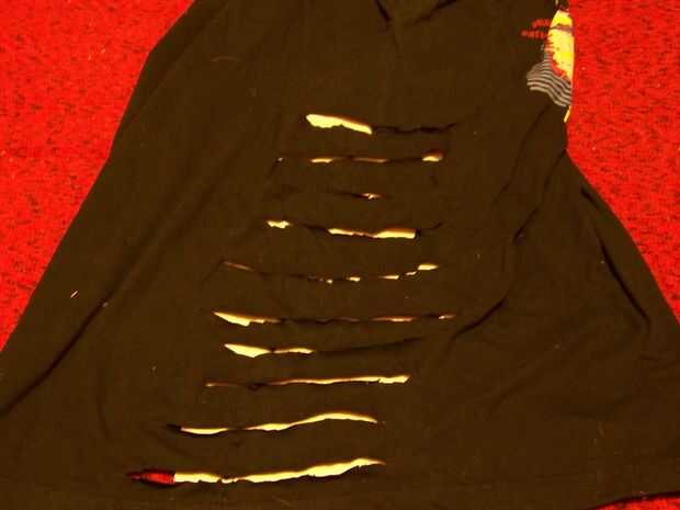 Versión masculina: Comenzando en la parte inferior de la camisa, hacer cortes va horizontalmente unas 6 pulgadas de largo, tal vez a mitad de camino o más encima de la camisa. Hice mi cortes a 1 1/2 pulgadas alejados uno del otro. Después de esto usted puede cortar las mangas, pero dejé mi sobre. Hacer esto para ambos lados y la versión masculina es completa y ahora tiene su nueva camiseta!