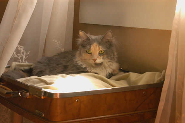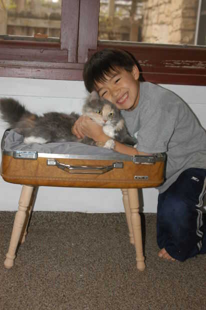 Ahora retirada su cama del animal doméstico nuevo! Poner una bonita cómoda almohada o manta en él para su gato o animal pequeño y que disfruten! Si desea, puede crear una mascota "litera" mediante la compra de cuatro patas más y mejores placas (recta, no inclinada) y sujete la misma manera. No uso mucho patas porque desea que sea robusto y seguro. Puedo hacer esto en el futuro como mi otra kitty le encantaría tener su propia cama también! Por ahora, mi gato Tommy es muy feliz y disfrutando de su cama!