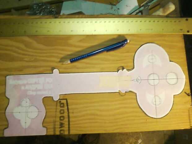 Con cinta la plantilla a mi pieza de madera contrachapada y marcados los centros de todas las posiciones de los orificios con un martillo y un punzón (una pluma funciona igual de bien también).