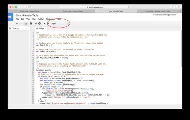 9) Presione el botón de "sync". (Si el guión requiere click autorización que la aplicación necesitará ser autorizado. Haga clic en "Continuar"; Haga clic en "Permitir") la secuencia de comandos fallará, pero eso es bueno! Haga clic en detalles.