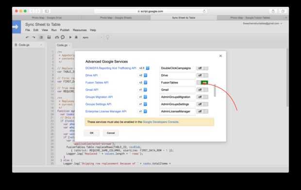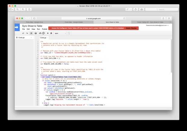 "Acceso no configurado. API de cuadros de fusión no se ha utilizado en proyecto 1029415516663 antes o está deshabilitado. Permiten visitando https: //console.developers.google.com/apis/api/fusiontables/overview?project=YOURPROJECTNUMBER luego reintentar. Si usted habilita esta API recientemente, espere unos minutos a la acción de propagar a nuestros sistemas y vuelva a intentarlo. (línea 20, "Código" del archivo")