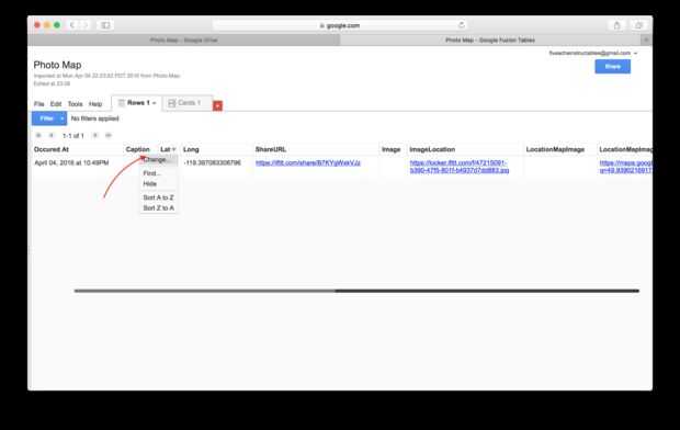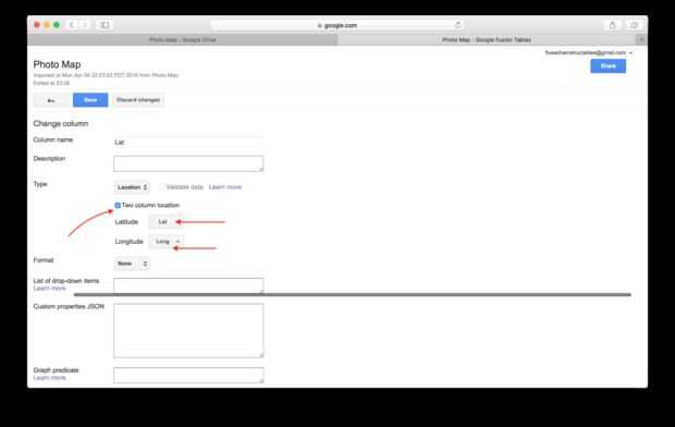 Usted necesitará decirle a Google Fusion tablas donde los datos de localización estan en la hoja de cálculo. Haga clic en la flecha al lado de "lat" y haga clic en "cambiar"