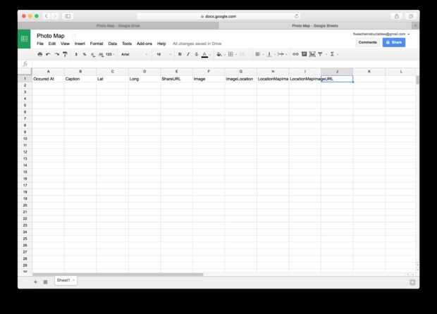 Crear una nueva hoja de cálculo en la unidad de Google. Había etiquetado mi hoja de cálculo "Photo Map". En la fila, cada columna de la etiqueta como sigue: