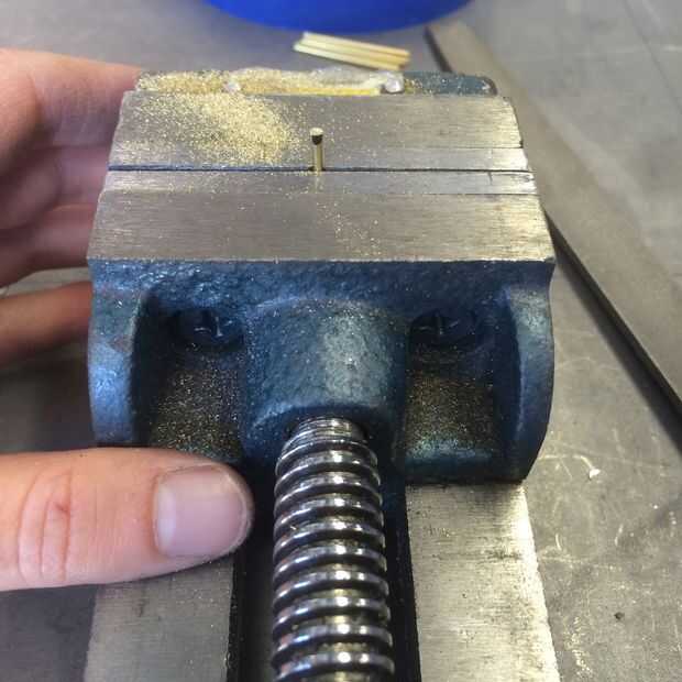 En un paso anterior, nos escariado nuestro a través de los agujeros para ser exactamente 1/16". La barra seleccioné mide 1/16" de diámetro, así que es un ajuste apretado, pero funciona.