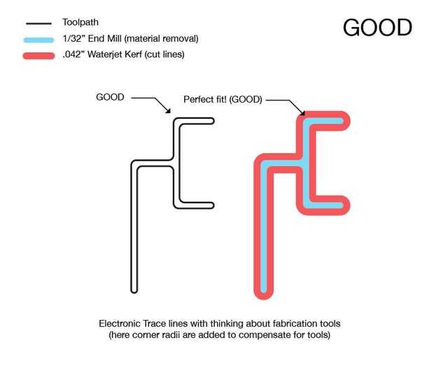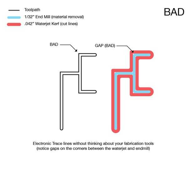 Es mejor hacerlo en el archivo de diseño, antes de llegar a su chorro de agua y paso de toolpathing de fresado CNC. De esta manera sólo tienes que preocuparte una vez. Encima son dos diagramas para ayudar a explicar por qué es importante compensar sus herramientas. Los diagramas de arriba muestran un ejemplo de un rastro electrónico. Un diseño no compensa para la anchura de la herramienta y corte, el otro no.