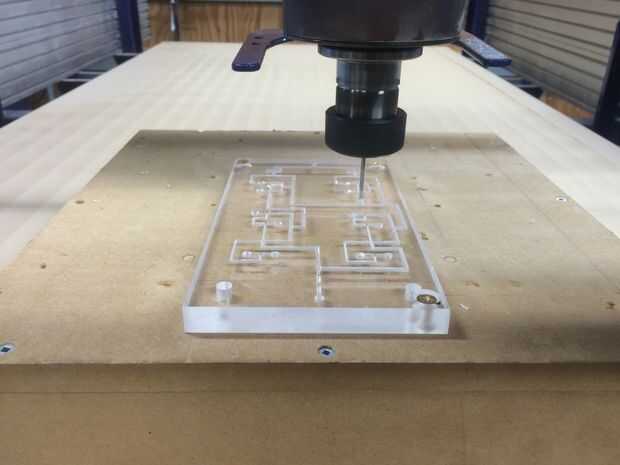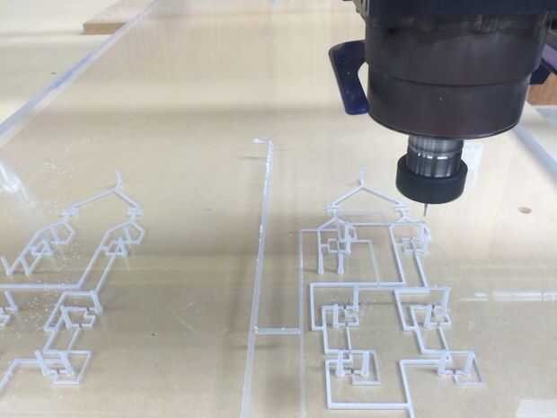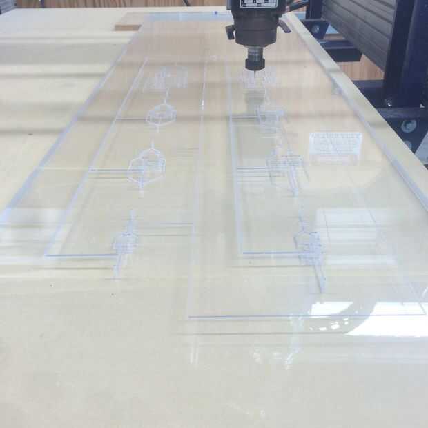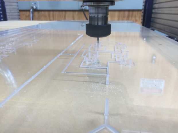 - Si se muele acrílico, asegúrese de molino en áreas pequeñas como sea posible. Acrílico del molde no es perfectamente plana. Mi pieza fue 1.25" espesa y variada de 1.1" a 1,28". Para incrustaciones que. 12" de espesor, esta diferencia es muy significativa. Asegúrese de que su eje z como cerca de cero donde se muele como sea posible. No supongas 1 z cero trabajará para su pieza entera!