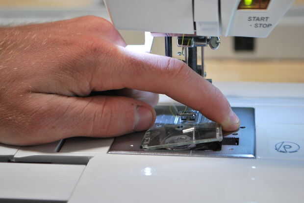 Abrir la puerta de plástico transparente en la parte inferior de la máquina y coloque la bobina dentro. Asegúrese de que el hilo se enrolla alrededor de él hacia la izquierda y enganchar el extremo del hilo en el gancho de metal pequeño en el frente de la caja de la bobina.