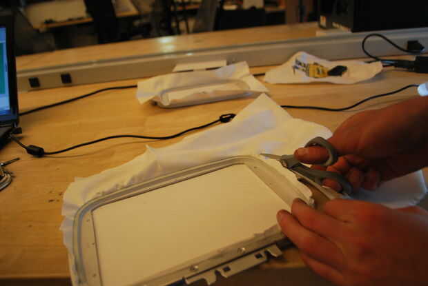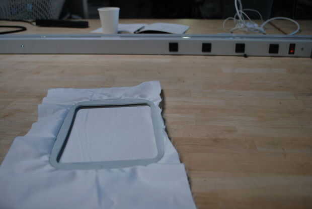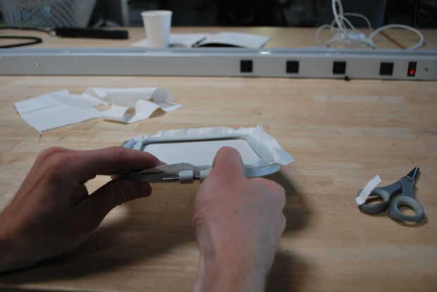 Comience por aflojar el tornillo de pulgar en el lado del aro y separar las dos partes. Cara el aro para que el soporte esté apuntando hacia abajo y coloque a la tela en la parte superior. Ahora presione la parte interior del asa en el exterior, pellizcando al tejido entre las dos partes. Como usted apriete el tornillo de palometa estire la tela también. Esta parte es un poco complicada y podría tomar algún tiempo para obtenerlo suficientemente apretada.