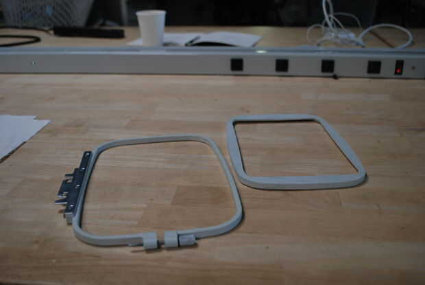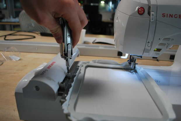 Colocar el aro en la máquina y apriete de los tornillos que sujetan en su lugar bastante maldito apretado. Aunque estos son tornillos moleteados, sugiero utilizar un destornillador para esto en lugar de simplemente apretando con los dedos. Si los tornillos se aflojan con todas las vibraciones en la máquina su bordado puede salir torcida.
