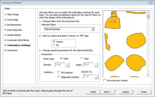 En la siguiente ventana usted puede seleccionar el tipo de puntada para cada bloque de color. Esto es similar a la barra deslizante en el número cinco de la ventana. Si hay bloques específicos que le gustaría estar cosida como una columna en lugar de un relleno puede aquí También puede elegir el ángulo de los puntos de sutura y el tipo de puntada pero siempre he escogido los valores predeterminados aquí.