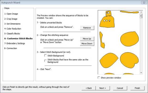El siguiente conjunto de opciones te pregunta acerca de bloques de color individuales. Mostrará cada bloque individualmente en el lado y tienes la opción de eliminarlos. Tenga en cuenta que si elimina un bloque de color no conseguir rellena con el color de puntada alrededor. Esta ventana también te pregunta si quieres coser el fondo y cualquier bloques del mismo color que el fondo. Te sugiero optar por ambos.