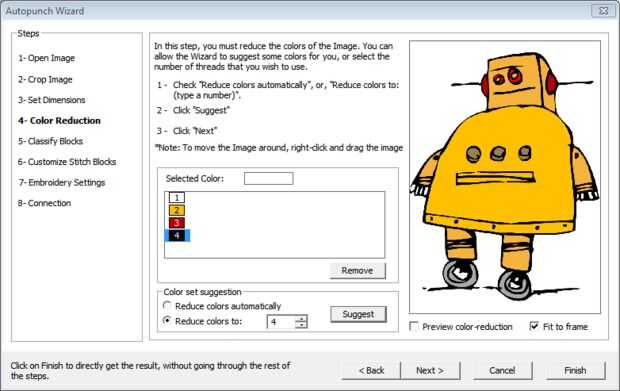 La siguiente ventana le solicita que elija un número de colores para reducir la imagen a. En este caso es mejor elegir un número relativamente bajo para reducir cambios de hilo y la confusión de la máquina. Confía en mí, esta máquina consigue confundirse fácilmente, colores menos es mejor.