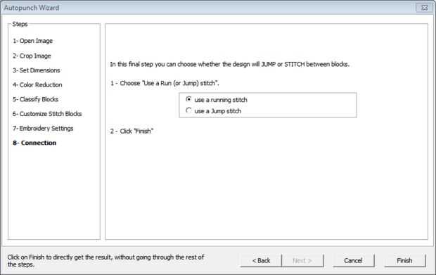 El paso final le pregunta si desea 'jump' o puntada entre bloques. Esto parece una pregunta loca para mí. solo para ver lo que haría, yo elegí puntada una vez y poner las líneas de color todo mi diseño. A menos que sepa algo yo no sugiero siempre seleccionando 'jump'.