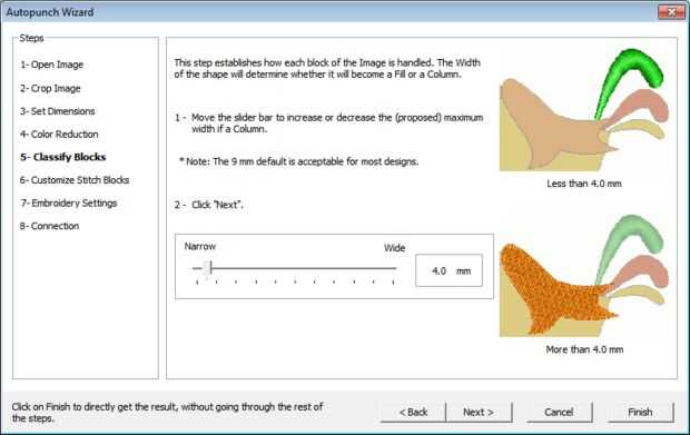 Número cinco de la ventana se refiere al tipo de bordado a utilizar para cada bloque. De grandes bloques de la máquina coser muchas veces como que se mueve de un lado a otro. Esto crea una superficie más suave con menos hilos sueltos. Para bloques más pequeños hará sólo una puntada. La botella en esta ventana le da la opción de cambiar lo que la máquina considera un bloque lo suficientemente pequeño para una sola vez. Sugiero bajar el umbral a algo alrededor de 4mm a 6mm.