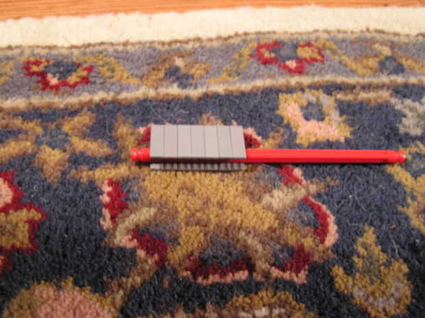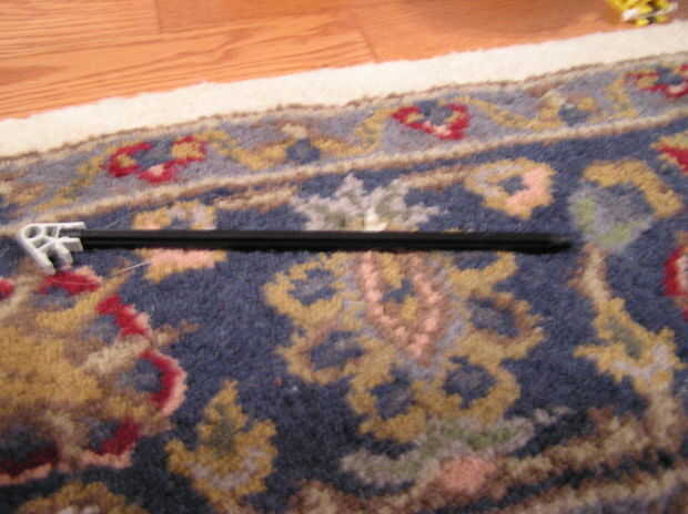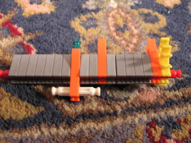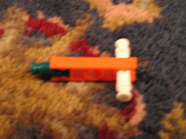 para comenzar haga clic en siete de las piezas grises a un extremo de la barra del rojo, luego tomar una pieceand naranja conectarse un trozo blanco, añadir una barra verde en el otro extremo. después de haber hecho esto Deslice el conector naranja a la pieza roja poniendo el extremo de la varilla a través del agujero de la pieza gris.