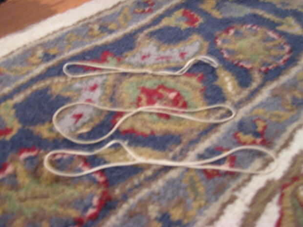 el poner un extremo de la goma elástica a través del orificio en la cuña, asegurándose de que la cuña es opuesta al conector rojo.