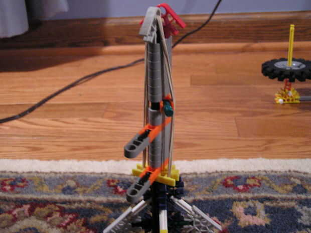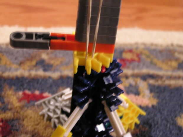 enganchar los extremos de la goma banvd en la "V" formó la parte del conector amarillo de entre la primera y segunda ranura. Esto es importante porque si pones las gomas en ningún otro lugar le strian la varilla negra extrañamente y breack ricket cuando intenta iniciarlo. a través de los otros dos gomas y tire hacia atrás la cuña hasta que la pieza naranja bloquea la barra de ir a través.