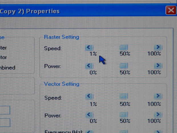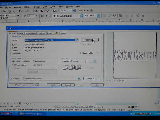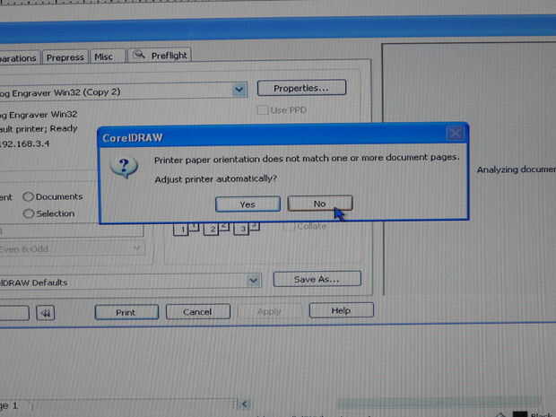 Seleccione Imprimir en la barra de tareas superior. Seleccione no para el siguiente símbolo del sistema. En la ventana de impresión que aparece, haga clic en propiedades. Cambiar el tamaño de la muestra de la configuración predeterminada. En este caso, será 3,5 "x 12". A continuación establece la velocidad de trama en 30 y el poder de trama de 100. Mi mini 18 es un 25 vatios. Si utilizas un poder diferente, ajustar por consiguiente. Láseres más tendrá un libro que viene con ajustes de velocidad y potencia de recomendados. Seleccione ok en la configuración de propiedades. A continuación, haga clic en imprimir en la ventana de impresión.