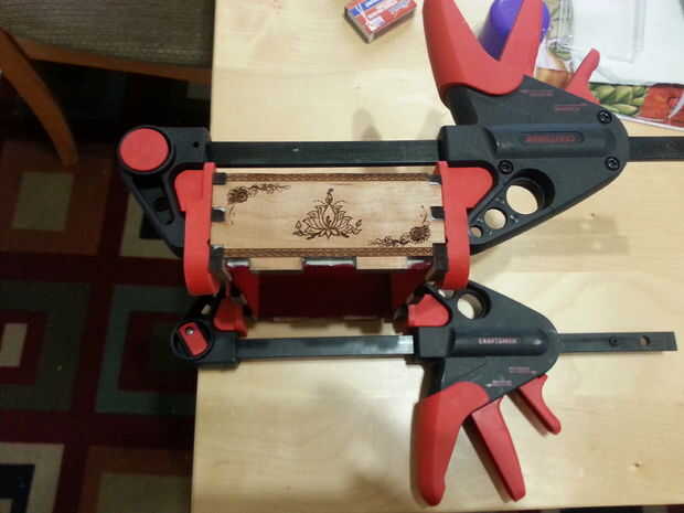 1) agregar el pegamento en el interior de los campos de todos los lados. Deje que el pegamento para un par de minutos y pegar todos los lados juntos. Entonces el rectángulo con una barra de la abrazadera abrazadera. Si no tienes una barra de la abrazadera se pueden utilizar unas bandas de goma que también funciona muy bien.