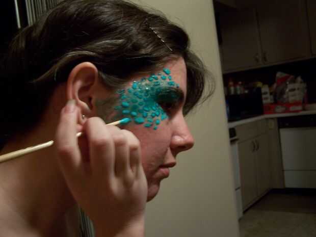 Apliqué las escalas como mostrado en mi cuerpo desde el paso anterior, tipo de radiación hacia fuera de las zonas más pesadas (hacer que usted punto sobre la capa de base). Personalmente me pareció que haciendo las escalas vean bien menos sobre cómo miraron las escalas individuales pero cómo se veían juntos. El tamaño, forma, direccionalidad de cada escala realmente no necesita preocuparse sobre. Si crees que se ven fuera de añadir algunos más entre ellos. Si escala sangrados en otra no te preocupes, es sólo uno de cientos y no se notará. Desde que tenía pocas otras personas ayudarme, fue cubriendo sólo una parte de mi cuerpo y nunca tuvo que esperar a que un área secar sólo tuvo una hora y media.