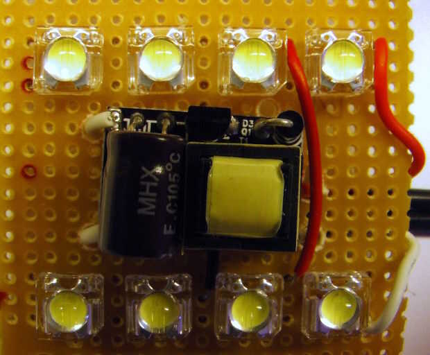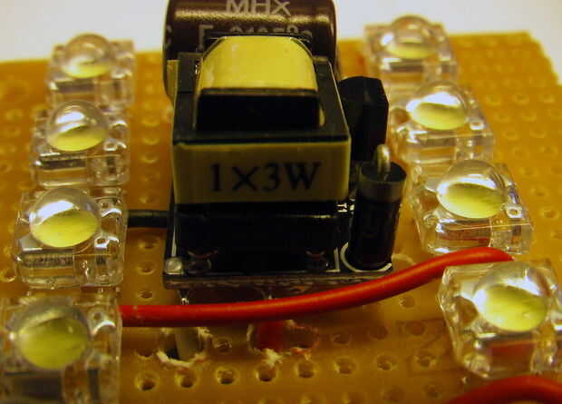 Aquí, he elegido un módulo de conversión diseñado para un solo LED de 3 vatios en sobre 700mA de energía, pero han unido a los LEDs de 8 x 100 miliamperios "Superflux" en paralelo, que me permite simplificar la dispersión de calor hundimiento y luz.