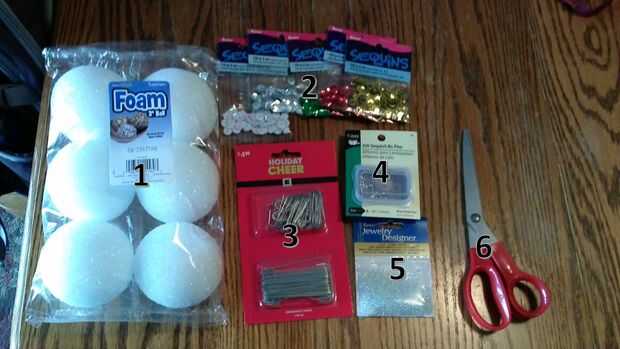 1. espuma de poliestireno esferas-éstos son esferas de 3", pero podría recomendar va incluso más pequeña para su ornamento de la primera. El más pequeño es, menos tiempo tomará para cubrimos en lentejuelas. También, podría utilizar verde, flor, arreglo de espuma pero de la voluntad de la esfera es probable que se muestran a través de las lentejuelas, así parece.
