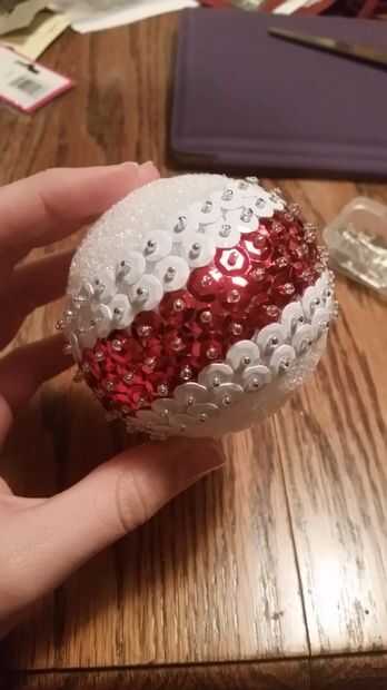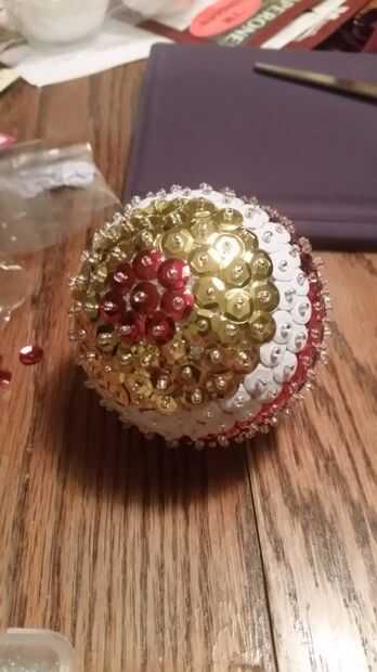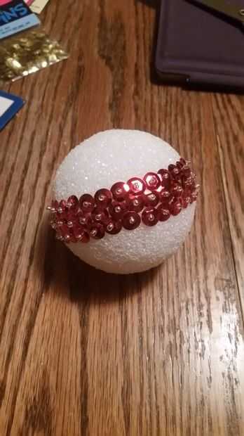 Por último, rellena el espacio restante con lentejuelas rojas. No era bastante aún, pero que está bien. Además, no se preocupa si usted puede ver las partes pequeñas de la superficie de la esfera entre las lentejuelas. Al final, no tiene un gran impacto en la apariencia del producto.