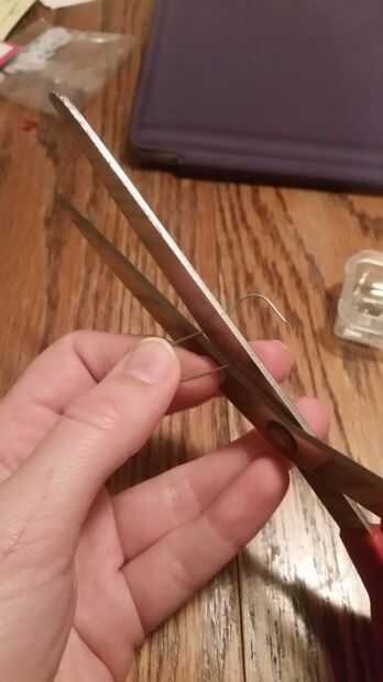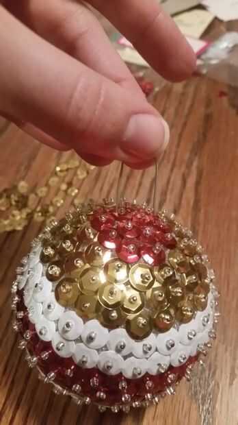 Para terminar, usted apenas necesita dar a su ornamento una percha. Elegí doblar y cortar un gancho de adorno de un lazo, que luego empujó dentro de la esfera.