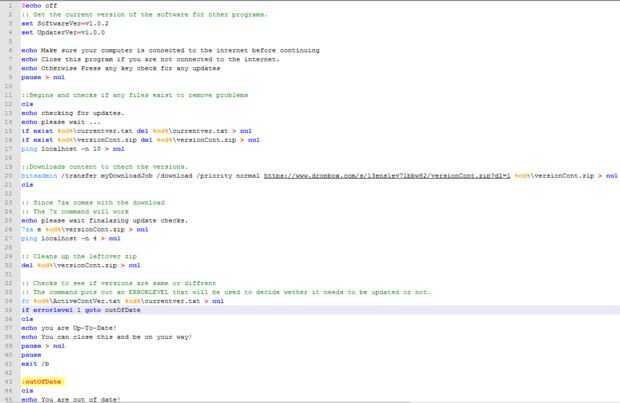 : : Inicia y comprueba si existen ficheros para eliminar problemas cls echo comprobar para actualizaciones. echo por favor espera... Si existe %cd%\currentver.txt del %cd%\currentver.txt > nul si existen %cd%\versionCont.zip del %cd%\versionCont.zip > nul ping localhost -n 10 > nul