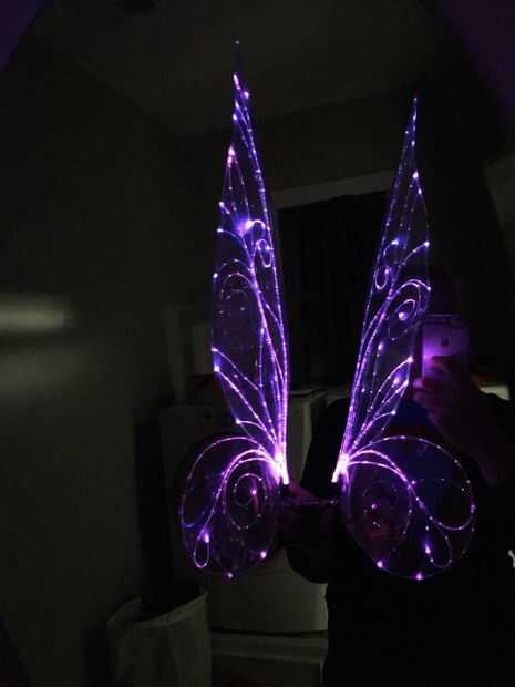 Mientras que las alas son muy cool por sí mismos, la verdadera magia es usarlos en los parques de Disney (durante las vacaciones que permiten a adultos a usar disfraces, por supuesto). Las alas están hechas de vinilo, abrigo tornasolado, alambre y cable óptico de fibra de chispa. El arnés es 3D impreso, con el hecho con la magia Minnie arcos y batería AAA.