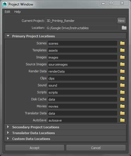 En la captura de pantalla de ejemplo, creé una nueva carpeta de proyecto llamada 3D_Printing_Render que se almacenará en mi Calculator unidad Instructables/camino. No dude en tuyo poner dondequiera que usted quisiera. Lo que usted como su proyecto actual será la nueva carpeta creada que contiene todas las carpetas que a continuación. Cuando Maya genera archivos para su proyecto, como rinde, temp procesamiento almacenamiento o las escenas ellos mismos archivos, pondrá en las carpetas definidas en la ventana de proyecto. Wooo, espacio de trabajo limpio. \o/