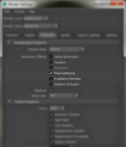 Los valores de FG (última reunión) son en la ficha de luz indirecta en su ajustes de procesamiento, pero por ahora, utilizaremos los valores por defecto para conseguir nuestro tiro. Reunión final tendrá la información de color de la IBL, disparando rayos de
