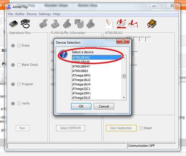 En FLIP, vaya a dispositivo > seleccionar > AT90USB162