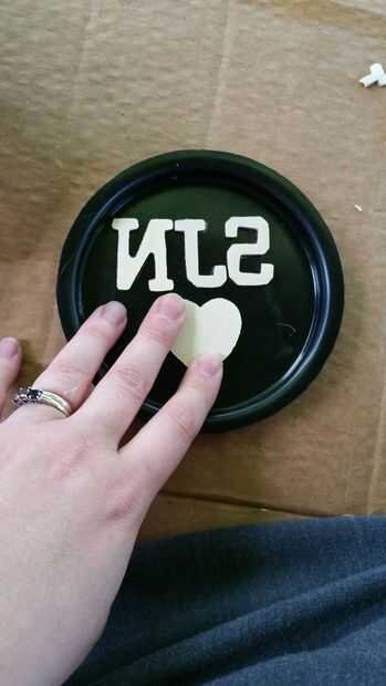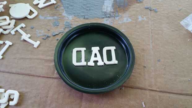 Averiguar lo que usted quiere en sus posavasos. Puede agregar cualquier cosa al molde como es no más grueso que el molde de sí mismo. Si utiliza iniciales, asegúrese de invertir sus cartas antes de aplicarlas a su molde.