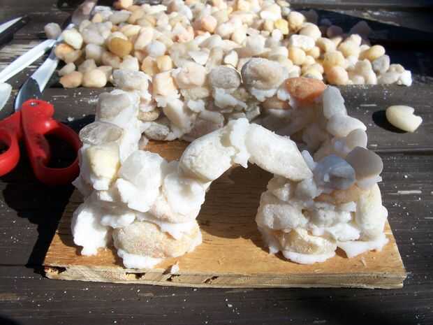 Comenzamos con un resumen de lo que queríamos que nuestros castillos como. Luego aplica mortero de arroz a lo largo del contorno. Luego presionamos las piedras en la argamasa de arroz. Asegúrese de utilizar piedras más grandes en la parte inferior. Si es pesado superior se caiga. Como hemos construido nos pondría el mortero de arroz sobre la piedra a colocar y bloquearlo en posición.