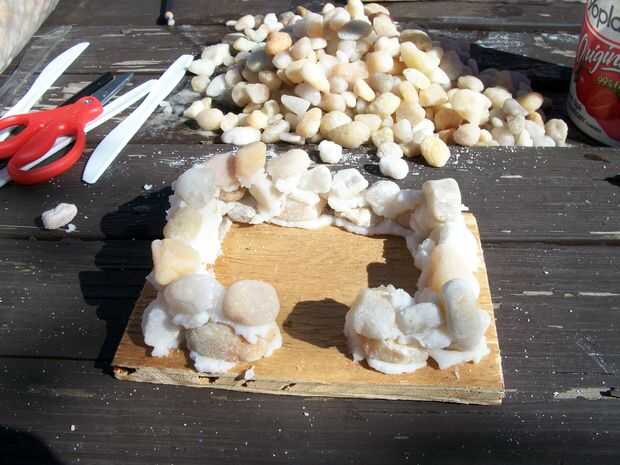 Usé los cuchillos de plástico espátula para extender el mortero de arroz hacia fuera. Esto me permitió pulsar el arroz sobre las piedras para asegurar buena adherencia.