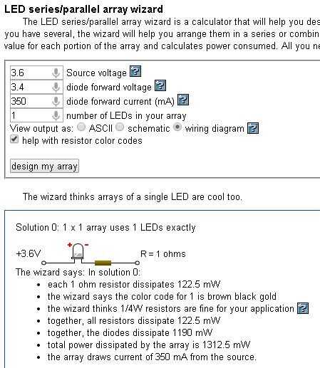 para este diseño que necesitaba 3 pilas AAA (1.2V cada) añadiendo hasta 3.6V en serie. otra vez, mi luz era 3, 4V en el máximo, así que necesito una resistencia. la tienda local del dólar o la tienda son los mejores lugares para encontrar opciones para iniciar algunos LED. Tuve un portapilas que tomé aparte de un mini ventilador del escritorio desde el almacén del dólar, que funcionó en 3 x AAA. usted no puede conseguir estas piezas de Radioshack o eBay para esto barato. Este portapilas ya tenían en él un interruptor y una resistencia, que calculó en cerca de lo que necesitaba. usando la calculadora de LED; http://led.linear1.org/led.wiz vemos que necesito un 1/4W - resistencia de 1 ohm. de la banda de color en la resistencia que fue el soporte de la batería, veo que es 8.2ohms 5% http://www.digikey.com/us/en/mkt/calculators/4-ban...). es más de lo que necesito pero es mejor así, de lo contrario se quemarán tus LEDs. por esta razón necesitamos un controlador de LED, ya que este dispositivo ha construido en fichas que regulan el voltaje y el amperaje, manteniendo siempre la misma. mi diseño es muy básico, pero usted puede modificar fácilmente para ser mucho más potente.