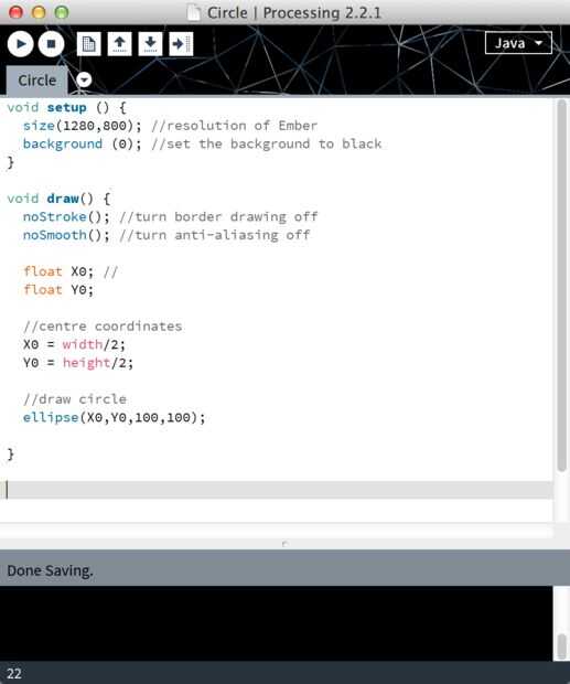 La chuleta que se muestra en el paso anterior tiene todas las funciones disponibles y diferentes declaraciones de dibujos. Googleando la forma que desea dibujar es también una manera rápida de encontrar la sintaxis correspondiente. En este ejemplo, yo quería dibujar 100 píxeles de un círculo de diámetro en el centro de la imagen.
