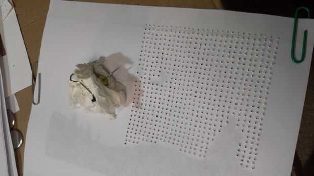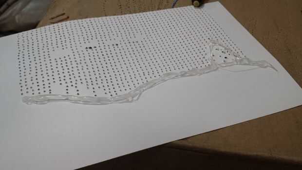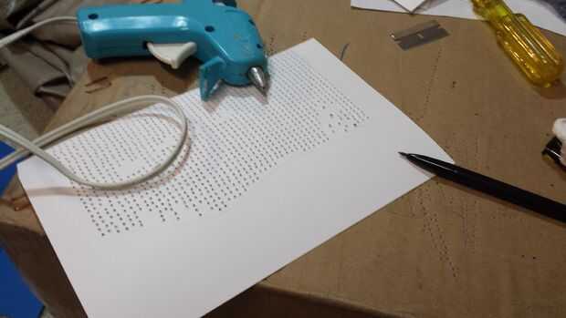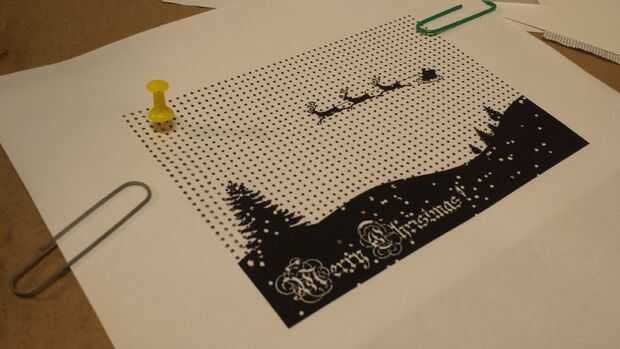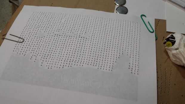 Una vez que imprime la cartulina, el punto del recubrimiento estructura hoja sobre la cartulina y un clip en su lugar. A continuación, tomar una caja de cartón vacía y utilícelo como la perforación de superficie. Tomar una chincheta y montar una carpeta pequeña pinza a "mango" (ver imágenes) y comenzar a perforar los agujeros. Para mi imagen, había agujeros alrededor 1.400 que necesitan para ser perforado. Hice dos piezas de un cartón a la vez. Tardó unos 30 minutos a 1.400 agujeros.