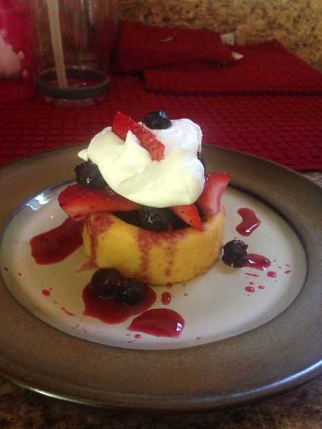 La placa de tu pastel de Ángel y cuchara de fruta y jarabe en Ángel... Para la presentación de la placa bastante rocía sobre placa demasiado y cubra con crema batida y fresas y un arándano. Literalmente se derrite en tu boca! ¡ Disfrute!