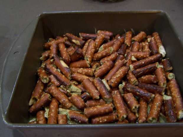 Cueza al horno en un horno precalentado de 30 a 60 minutos, revolviendo cada 15 minutos, hasta que los pretzels volver a la densidad de pretzel duro y la capa es sólido y no pegajosa o húmeda.