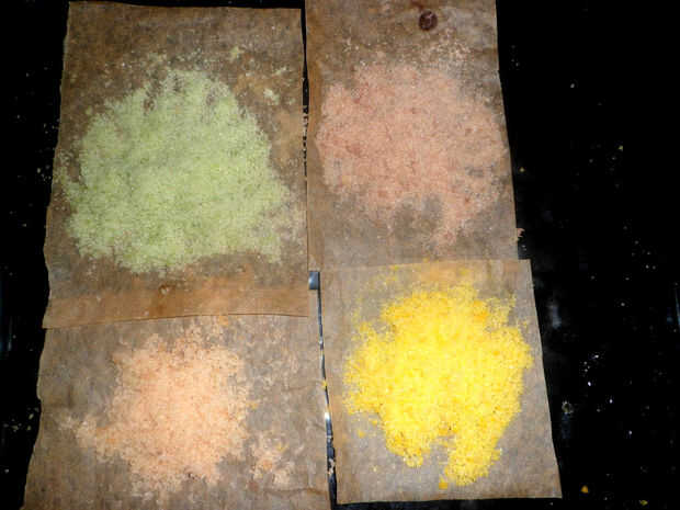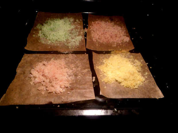 -Utilice el mismo procedimiento como se mencionó anteriormente para el azúcar excepto en vez de separarse como bloques en placa para horno apenas como fina capa y cocer durante sólo 10 minutos a 180 grados