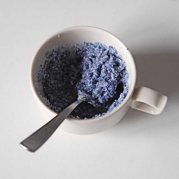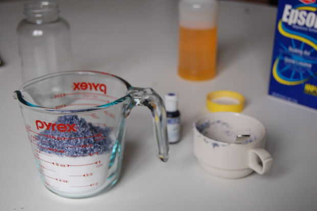 Combinar la sal con aroma color con el resto de la sal de Epsom, revuelva hasta que el color esté uniforme, luego Vierta en el recipiente.