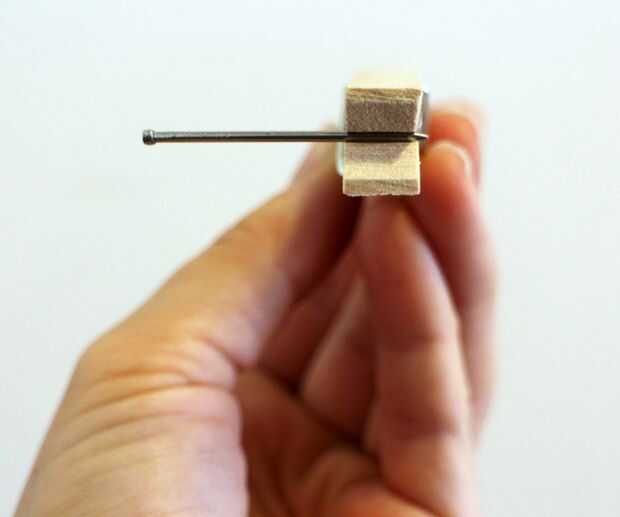 Sujete el clavo con el pin de ropa de modo que la punta de la uña queda asomando por el lado que te pones contra la pared.