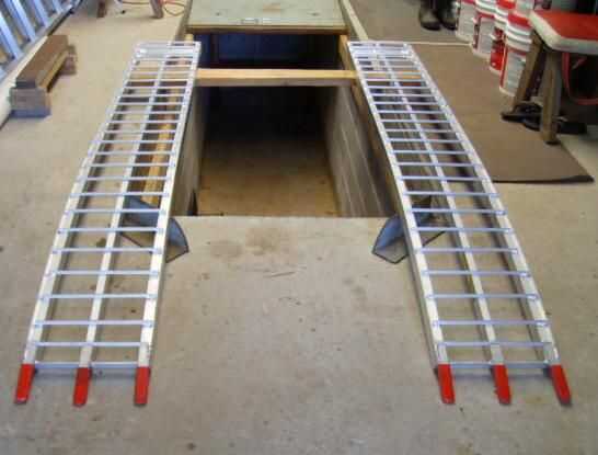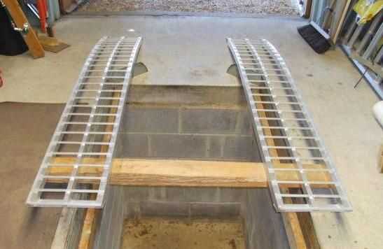 Coloque la madera a lo largo de los rieles laterales de la fosa, luego colocar las rampas desde el piso a la madera. Ajustar la distancia entre las rampas para que coincida con la distancia entre ejes de la podadora. La curva de las rampas de puentes los rieles ángulo corto. La segunda foto es una vista desde el piso de las rampas.