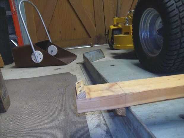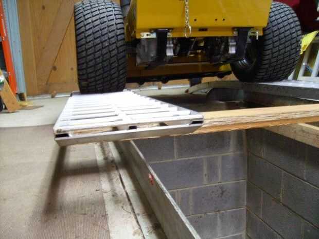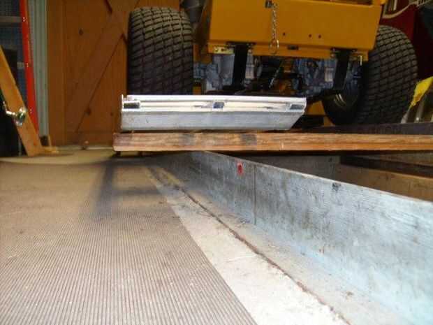 La madera se basa en los rieles de metal elevada del hoyo. Es esencial que la madera sea lo suficientemente largo que sus extremos se extiendan más allá de los bordes exteriores de las dos rampas. Listones de madera se añaden a los extremos de la madera para hacer más fácil las rampas del espacio a tal fin y garantizar que las rampas no se mueva de los extremos de la madera. Dos tiras a la parte inferior de la madera facilitan la madera entre los bordes levantados del hoyo del centro. La foto con la madera tiras de muestra que la gran bestia amarillo aparcada y cómo las tres puertas del fuerte despegue en lugar sobre el hoyo cuando no esté en uso.