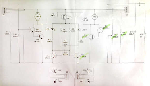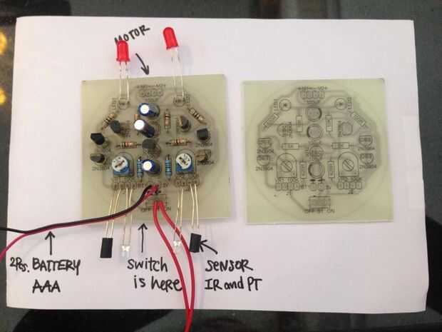 Este circuito sensor ha diseñado para combinar 2 circuito eléctrico de los sensores IR en 1 tablero. Esto significa que usted puede utilizar para hacer un sencillo juguete móvil o usar 2 sensor IR con este circuito como las fotos hay dos laterales de sensores y motores. Por lo que técnicamente, puede poner electrodomésticos solo lado de la Junta para usar sólo un conjunto de sensor y un promotor. (** Nota thet el motor estará en el lado opuesto de su circuito. Ejemplo de enemigo, M1 que se encuentra en la parte superior izquierda de la Junta usa todos los aparatos eléctricos en el lado derecho del tablero M2 serán otros en el lado izquierdo)