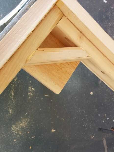 Yo adjunto una pieza cuadrada de tablones de madera en cada esquina para las piernas sujetar a y había reforzado con una pieza a inglete de listón como se puede ver en la segunda foto.